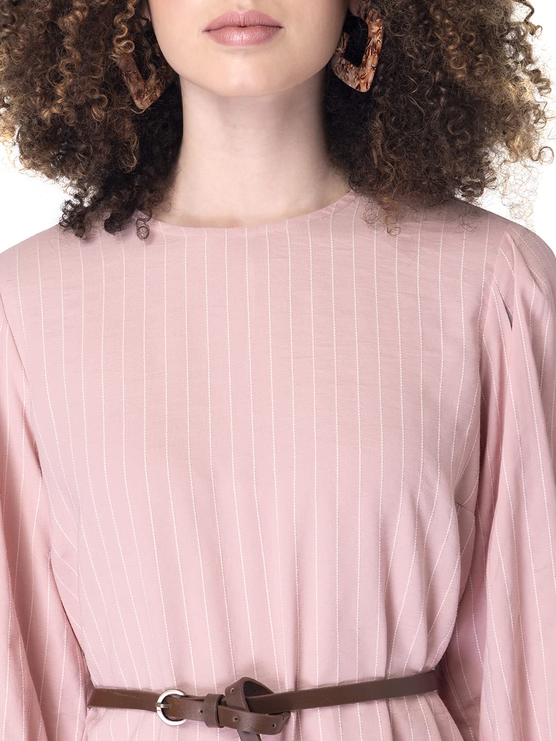 Basic but better, add this peach dress to your work closet. Tailored in a timeless striped print, it has a tiered hem and comes with a faux tan leather belt that accentuates the waist.