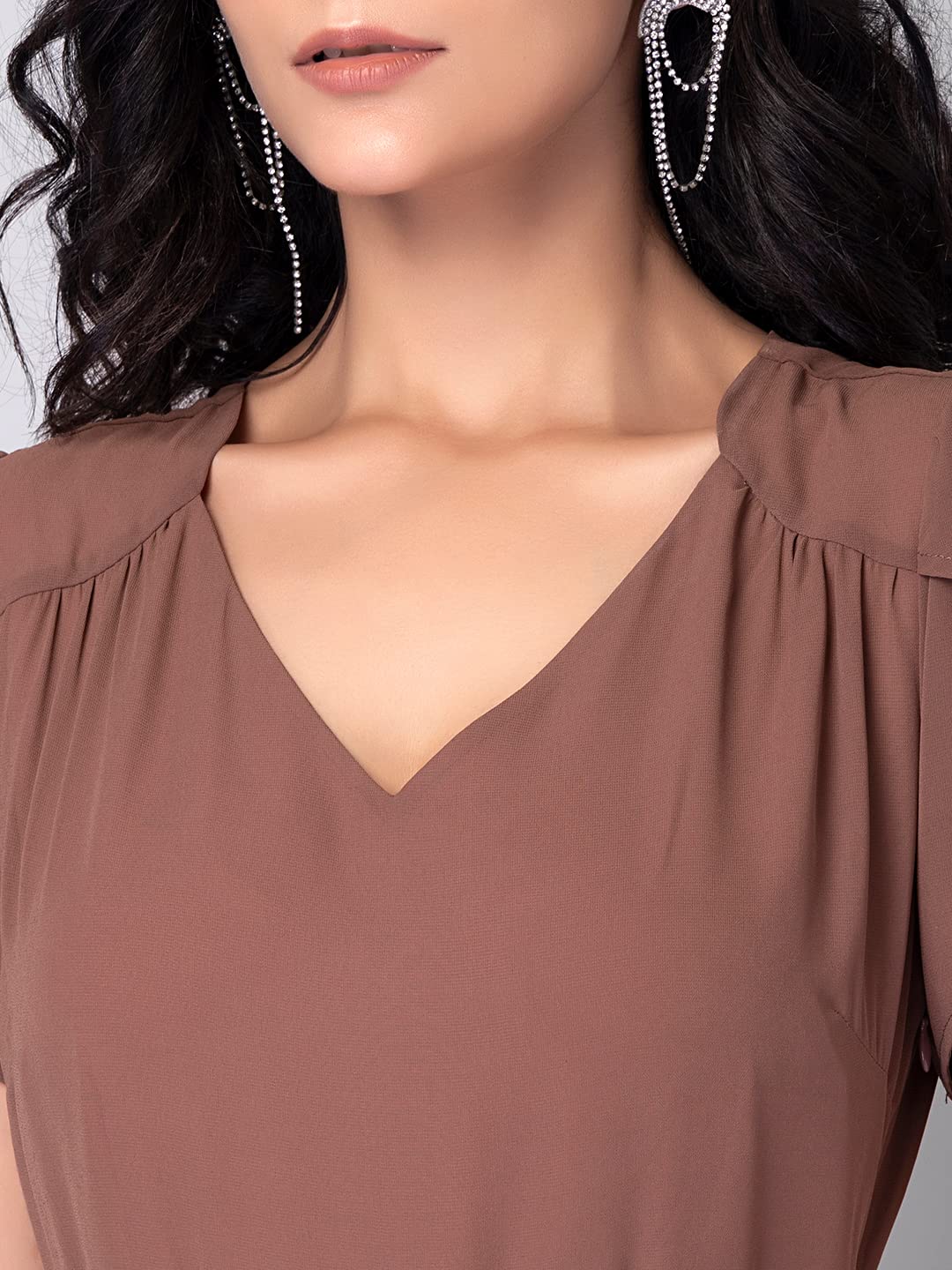 - Dusty pink maxi dress in georgette.Crafted with tulip sleeves, the dress features a V neck, short sleeves and a __ closure.The dress comes with an embellished detachable belt.