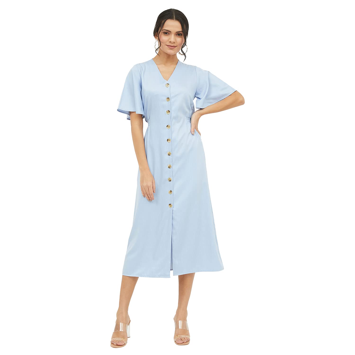 Blue Solid Woven Midi Dress, has a A-Line,V-Neck,Short Sleeves