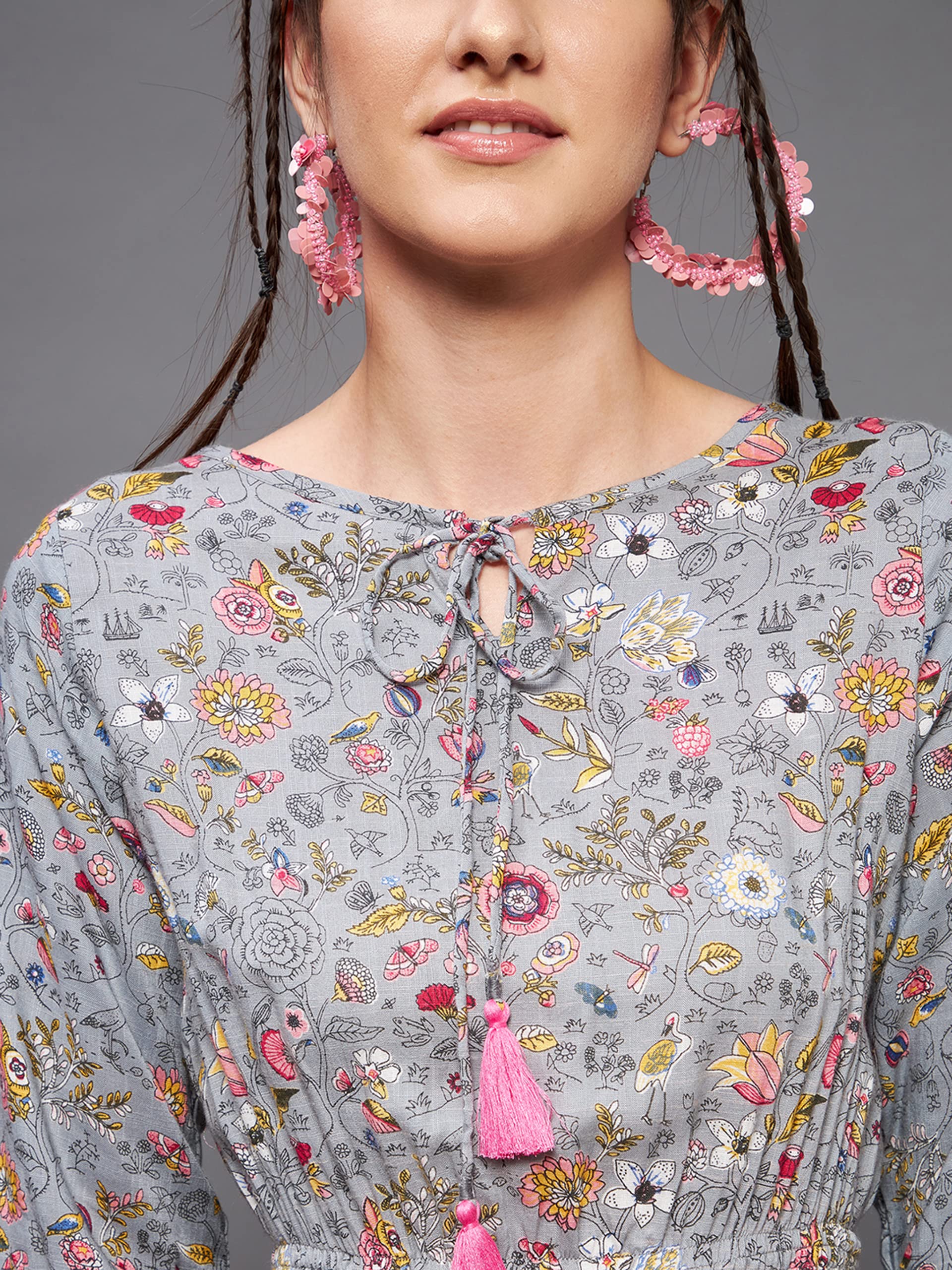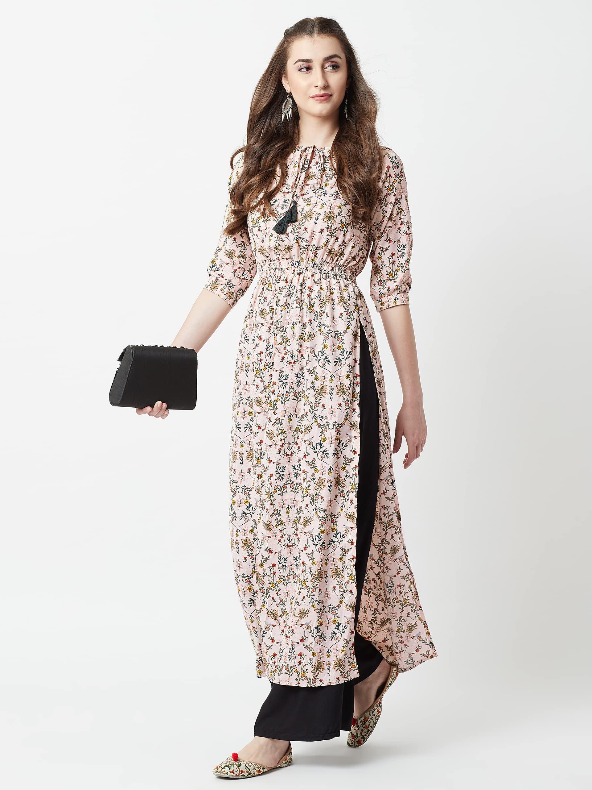 Multicolored with a peach base floral tie-up maxi top, has a round neck and 3/4 sleeves, has tassel detailing and a front slit.